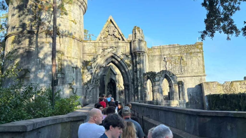 In de wachtrij buiten krijg je al het gevoel dat je door het betoverde bos loopt. Zo kom je onder meer het wachthuis van Hagrid al tegen, maar ook een houten vliegend paard en pompoenen. Voor het binnengedeelte van de wachtrij treed je het kasteel binnen. Daar vinden we verschillende sculpturen en murals van diverse Potter elementen, waaronder ook verwijzingen naar de oude attractie Dragon Challenge.